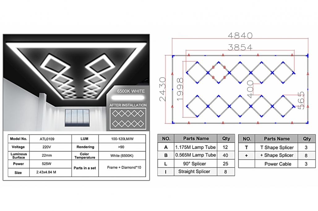 10 Square Ceiling LED Light System 4.84 x 2.43 m 6500K Dimmable Light