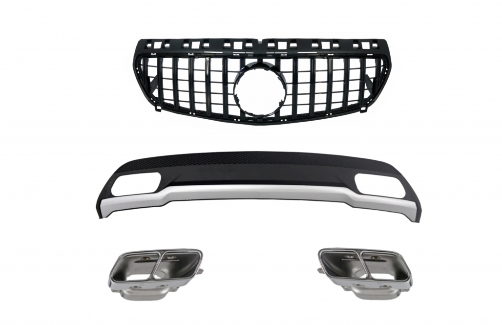 Air Diffuser with Exhaust Muffler Tips and GT-R Panamericana Grille All Black for Mercedes A-Class W176 (2012-08.2015) Sport Pack