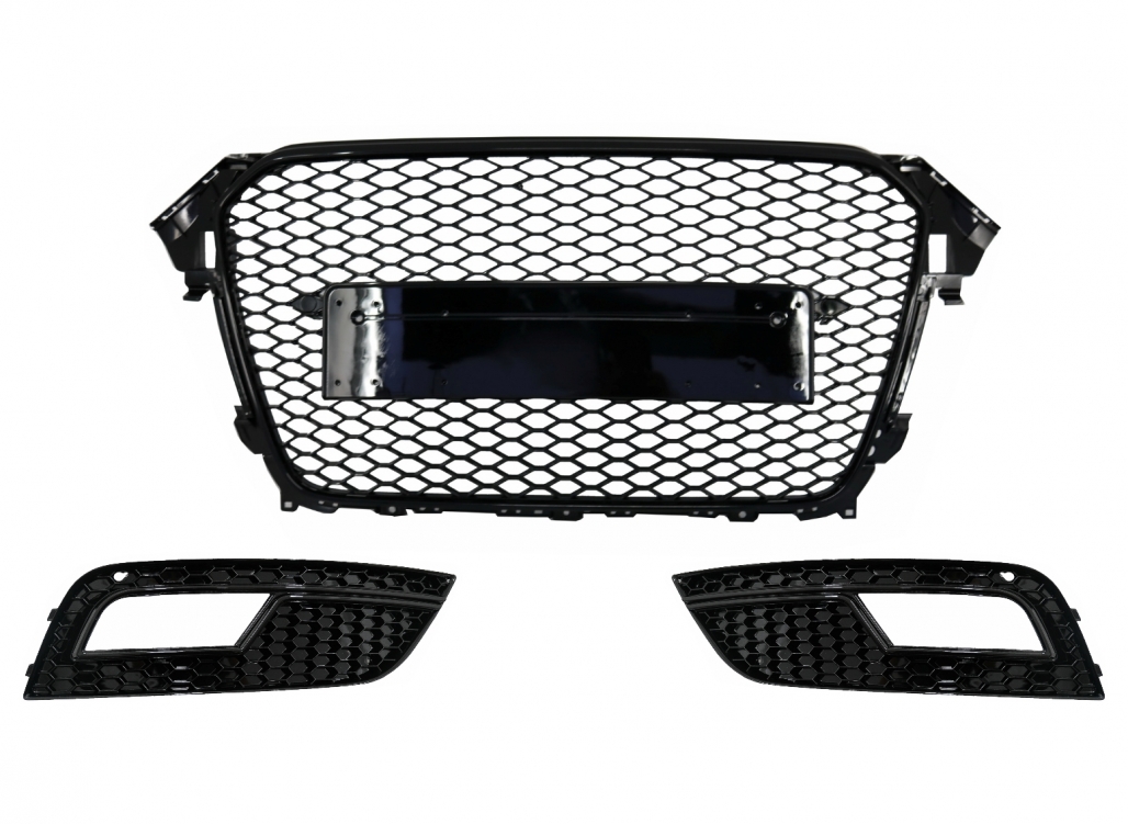 Badgeless Front Grille with Fog Lamp Covers suitable for Audi A4 B8 Facelift (2012-2015) RS Design Honeycomb Piano Black & PDC Covers