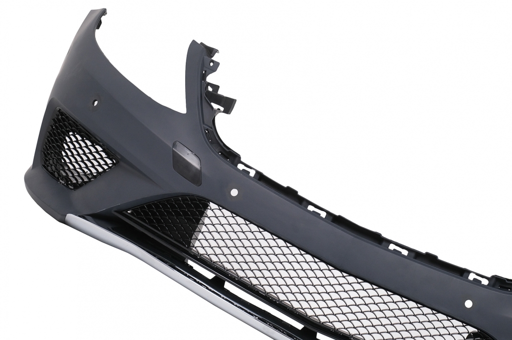 Front bumper equipped with central-lower grille and side grilles PDC holders tow hook cover and bumper extension spoiler.