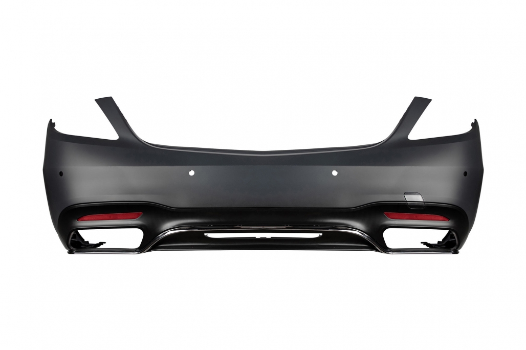 Rear bumper equipped with double outlet exhaust PDC holders and rear molding spoiler.