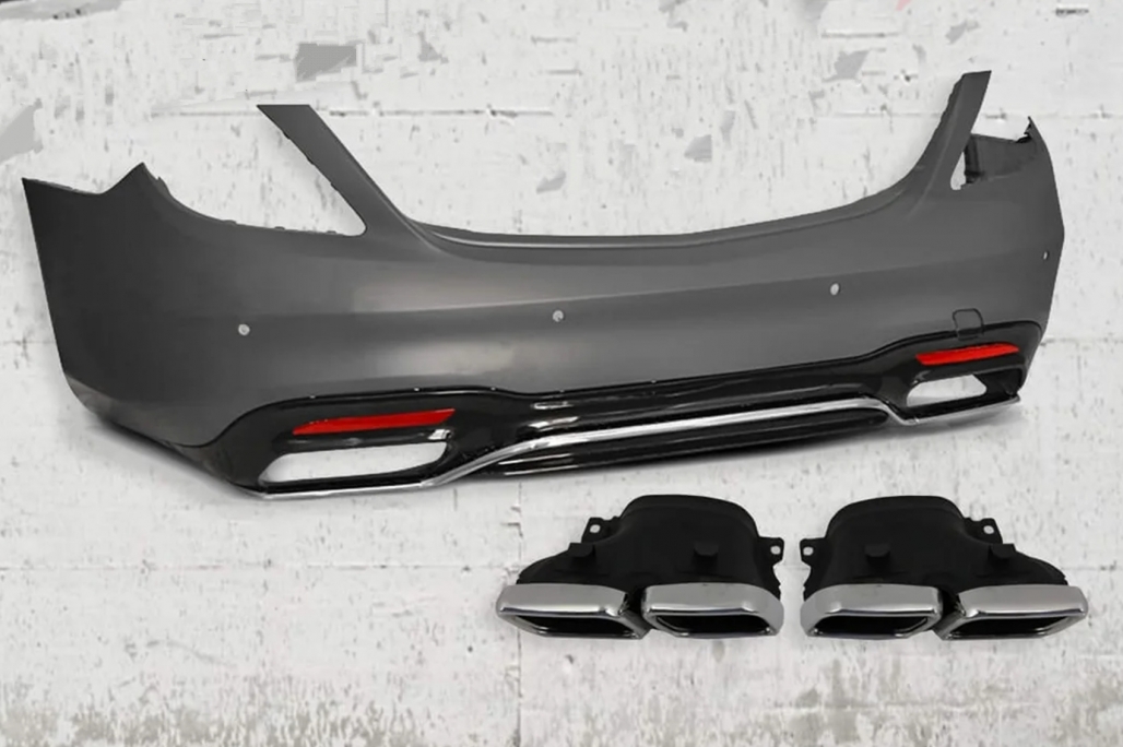 Rear bumper equipped with double outlet exhaust PDC holders and rear molding spoiler.