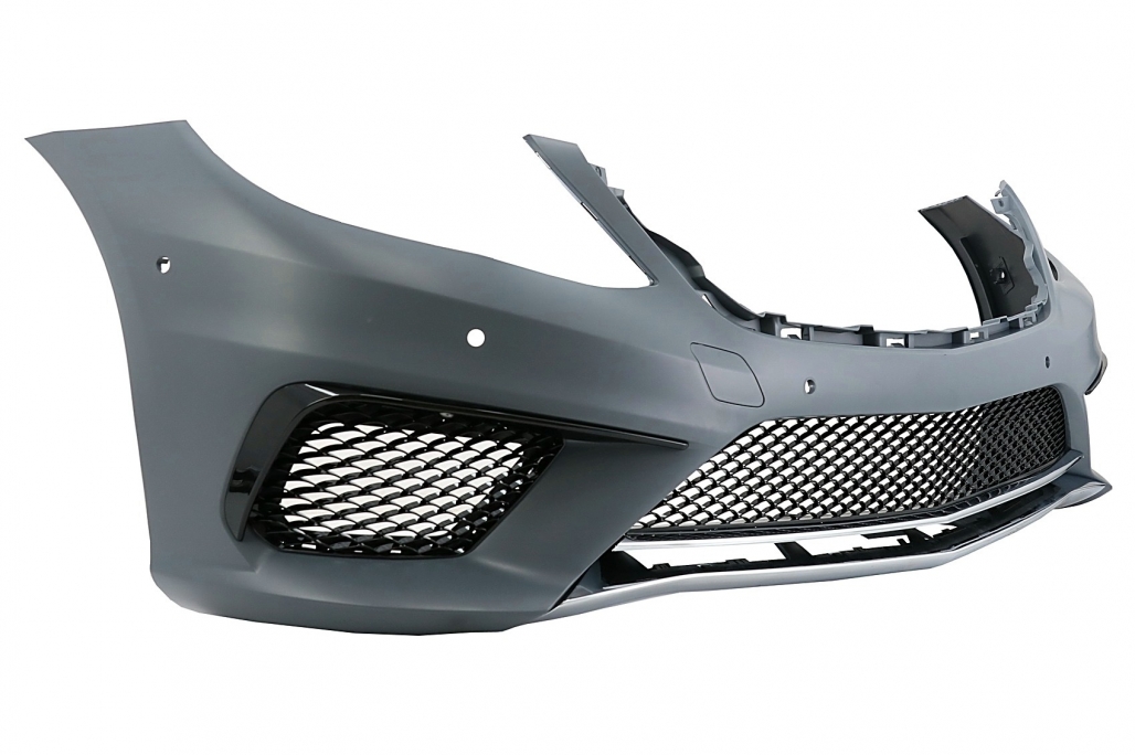 Front bumper equipped with central-lower grille side grilles and flaps PDC holders tow hook cover and front bumper extension spoiler