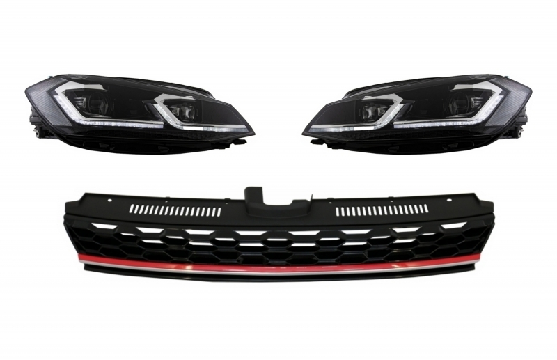 Central Badgeless Grille with RHD LED Headlights Sequential Dynamic Turning Lights suitable for VW Golf 7.5 VII Facelift (2017-up) GTI Design Red and Chrome