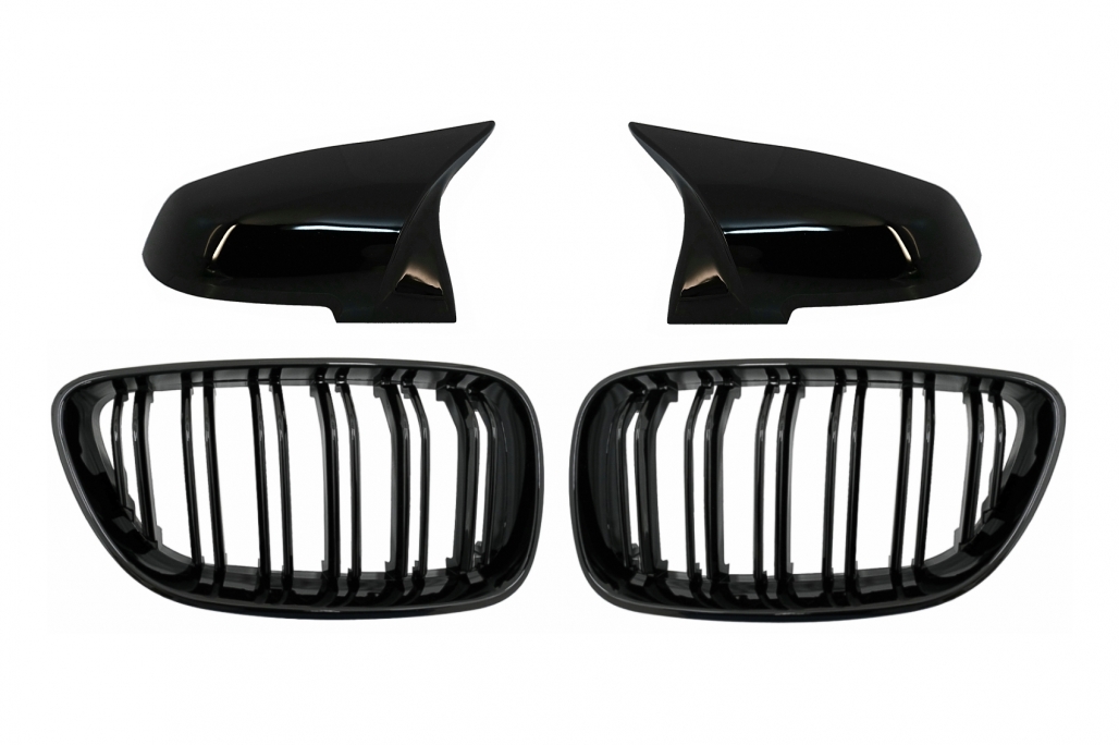 Central Kidney Grilles Double Stripe with Mirror Covers suitable for BMW 2 Series F22 F23 (2014-up) M Design Piano Black