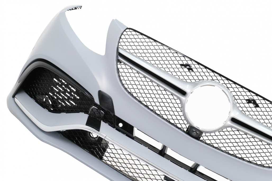 Front bumper equipped with central grille central-lower grille side grilles side fins parking sensors (PDC) supports and supports for camera system.