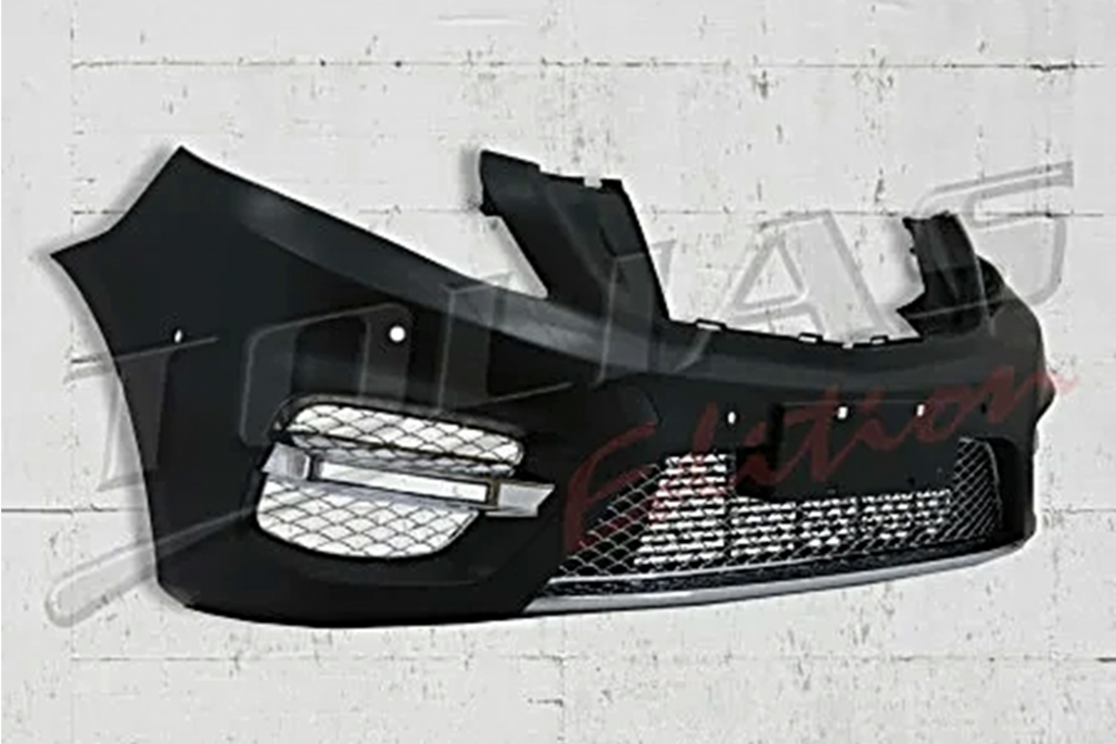 Front bumper equipped with central-lower grille side grilles PDC holders and brushed Aluminum front bumper extension spoiler