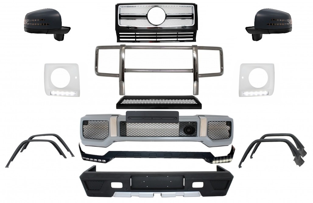 IntroThis complete conversion is meant to improve the look on your MercedesSuitable forMercedes G-Class W463 (1989-2018)Not suitable forMercedes G-Class W463 G55 G53 G63 G65 GenuineDescriptionFront Bumper equipped with front bumper steel reinforcement grilles ornaments intercooler grilles dummy Distronic/Radar Sensor and license plate support.