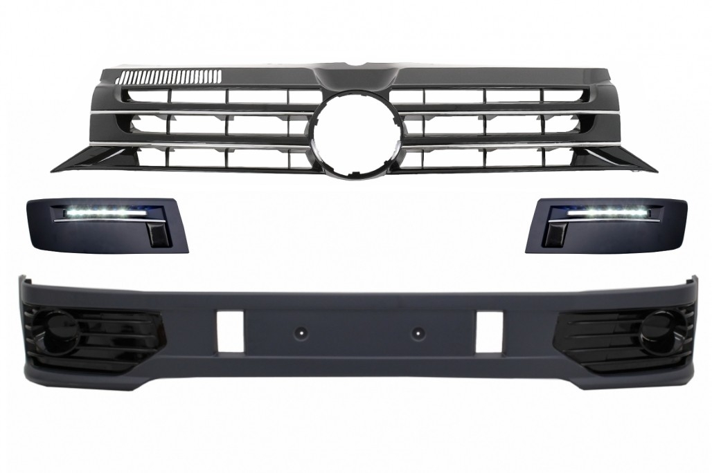 Front Bumper Add-on Spoiler with LED DRL suitable for VW Transporter Multivan Caravelle T5 T5.1 Facelift (2010-2015) and Badgeless Front Debadged Grille Sportline Design