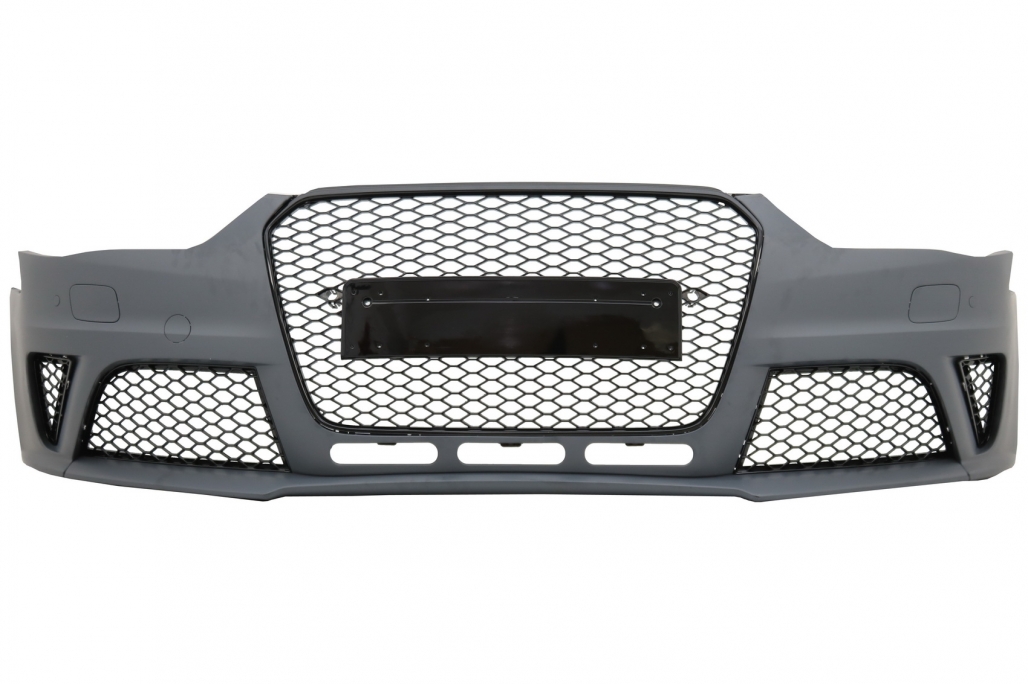 Audi A4 B8 with tow bar systemDescriptionFront Bumper RS4 design made from high quality polypropylene.