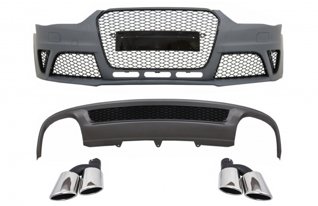 Front Bumper suitable for Audi A4 B8 Facelift (2012-2015) with Rear Bumper Valance Air Diffuser and Exhaust Muffler Tips Tail Pipes RS4 Design