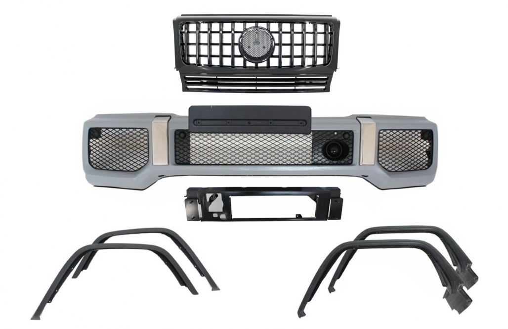 Front Bumper with Fender Flares Wheel Arches and Front Grille All Piano Black suitable for Mercedes G-Class W463 (1989-2018) G65 Design