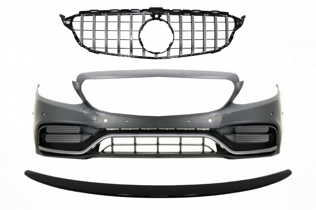 Front Bumper with Grille and Trunk Boot Spoiler Piano Black suitable for Mercedes C-Class C205 (2014-2018) C63 GT-R Design