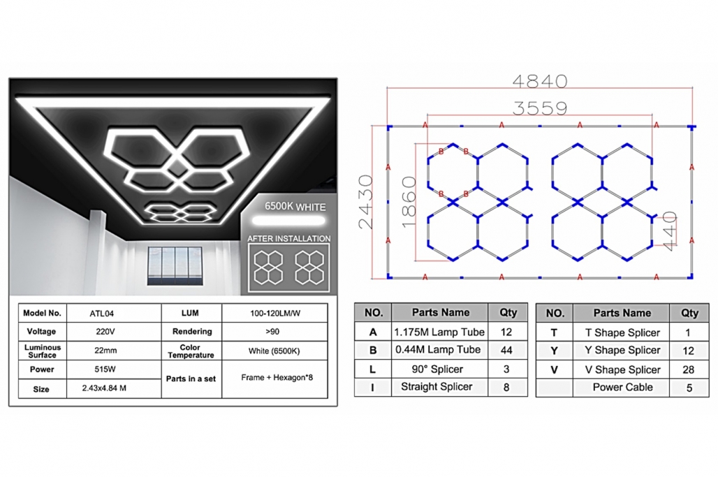 The lights are interconnected by special connectors available in various types. Depending on the selected model you will receive the necessary connectors for mounting. The entire lighting system connects to the network via a cable included in the package.Package ContainsHexagon HoneyComb Light SystemPackage dimensionsLength (cm): 140