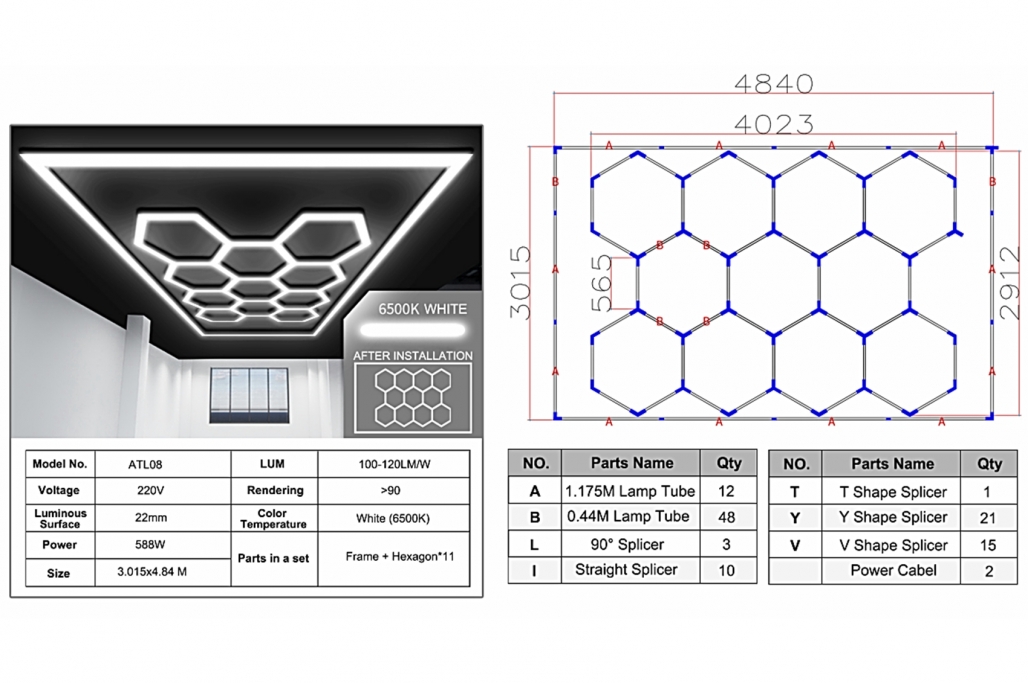 Hexagon HoneyComb Ceiling Light System 4.02 x 2.91 m