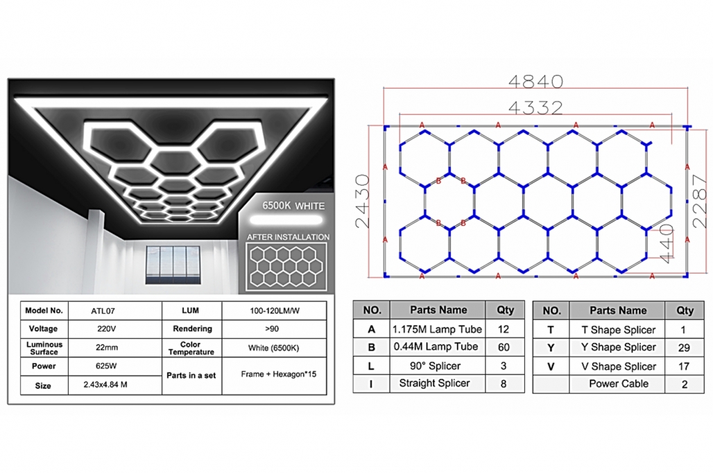 Hexagon HoneyComb Ceiling Light System 4.33 x 2.28 m