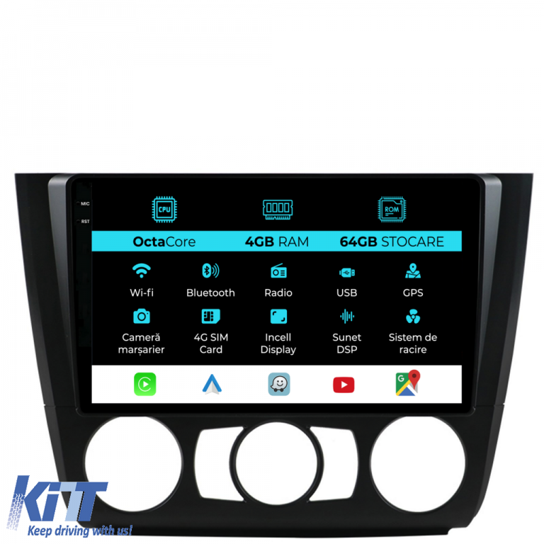 Old DescriptionOperating System: Android 13 Processor: Octa-core RAM: 4GB Internal Storage (ROM): 64GB Display Size: 9 Inch Screen Resolution: 1360x800p Bluetooth: Bluetooth for calls phonebook download and music playback WiFi: Yes (Integrated) 4G SIM Slot: Yes Network Connectivity: 4G phone hotspot external router 3G or 4G dongle CarPlay Android Auto Microphone: Built-in microphone with the possibility to connect an external microphone Power Supply: 12V Audio Power: 4x45W DSP Equalizer: Digital Sound Processor (DSP EQ) USB SD Compatibility: Suitable for USB up to 128GB SD support via USB adapter Android Apps Compatibility: Suitable for most Android apps from Google Play CarPlay and Android Auto Compatibility: Yes suitable for iOS (CarPlay) and Android (Android Auto) Language Support: Romanian English Hungarian Spanish Italian German etc. Screen Type: Capacitive TouchScreen multi-touch IPS Brightness Settings: Yes RDS Radio: Yes RCA Subwoofer Output: Yes RCA Video Output: Yes with the help of a USB adapter RCA Audio Output: Yes GPS: Yes (Google Maps Waze HereWeGo) Parking Sensors: Yes (Parking sensor pickup with display where applicable) Steering Wheel Control: Yes (Steering wheel commands pickup with canbus or analog where applicable) DVR Camera Compatibility: Yes Reverse Camera Compatibility: Yes User Manual: Yes Package Contents: Android Navigation Adapter Frame Power Wiring GPS Antenna 4G Antenna RCA Connectors Wiring for reverse camera 2 USB cables Canbus (only if applicable) Warranty Certificate Invoice Navigation is suitable for the following car brands: BMW: Series 1 E82 E88 E81 E87 (2004-2011).