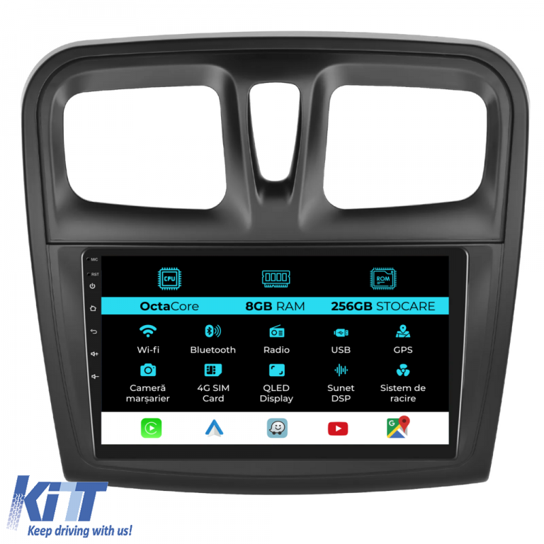 Old DescriptionOperating system: Android 13 Processor: Octa-core 2.0Ghz RAM: 8GB Internal storage (ROM): 256GB Display size: 9 Inch Screen resolution: 1280x720p Bluetooth: Bluetooth for calls downloading contacts and playing music WiFi: Yes (Integrated) 4G SIM slot: Yes Network connectivity: 4G phone hotspot external router 3G or 4G dongle CarPlay Android Auto Microphone: Built-in microphone with the possibility of connecting an external microphone Power supply: 12V Audio power: 4x45W DSP equalizer: Digital sound processor (DSP EQ) USB SD compatibility: Suitable for USB up to 128GB SD support via USB adapter Android applications compatibility: Suitable for most Android applications from Google Play CarPlay and Android Auto compatibility: Yes suitable for iOS (CarPlay) and Android (Android Auto) Language support: Romanian English Hungarian Spanish Italian German etc. Screen type: Capacitive TouchScreen multi-touch IPS Brightness settings: Yes RDS Radio: Yes RCA subwoofer output: Yes RCA video output: Yes with the help of a USB adapter RCA audio output: Yes GPS: Yes (Google Maps Waze HereWeGo) Parking sensors: Yes (Parking sensor integration with display where applicable) Steering wheel control: Yes (Steering wheel controls integration with canbus or analog where applicable) DVR camera compatibility: Yes Reverse camera compatibility: Yes User manual: Yes Package contents: Android navigation Adapter frame Power wiring GPS antenna 4G antenna RCA connectors Wiring for reverse camera 2 USB cables Canbus (only if applicable) Warranty certificate Invoice The navigation is suitable for the following car brands: Dacia: Logan 2 (2012 – 2020) Sandero 2 (2012 – 2019)