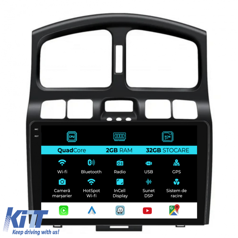 Old DescriptionOperating system: Android 13 Processor: Quadcore RAM Memory: 2GB Internal Storage (ROM): 32GB Display Size: 9 Inch Screen Resolution: 1360x800p Bluetooth: Bluetooth for calls phonebook download and music playback WiFi: Yes (Integrated) 4G SIM Slot: No Network Connectivity: Phone hotspot external router 3G or 4G dongle CarPlay Android Auto Microphone: Built-in microphone with the possibility of connecting an external microphone Power Supply: 12V Audio Power: 4x45W DSP Equalizer: Digital Sound Processor (DSP EQ) USB SD Compatibility: Suitable for USB up to 128GB SD support via USB adapter Android App Compatibility: Suitable for most Android apps from Google Play CarPlay and Android Auto Compatibility: Yes suitable for iOS (CarPlay) and Android (Android Auto) Language Support: Romanian English Hungarian Spanish Italian German etc. Screen Type: Capacitive TouchScreen multi-touch IPS Brightness Settings: Yes RDS Radio: Yes Subwoofer RCA Output: Yes Video RCA Output: Yes with the help of a USB adapter Audio RCA Output: Yes GPS: Yes (Google Maps Waze HereWeGo) Parking Sensors: Yes (Takeover parking sensors with display where applicable) Steering Wheel Control: Yes (Takeover steering wheel controls with canbus or analog where applicable) DVR Camera Compatibility: Yes Reverse Camera Compatibility: Yes User Manual: Yes Package Contents: Android Navigation Adapter Frame Power Wiring GPS Antenna RCA Connectors Wiring for reverse camera 2 USB cables Canbus (only if applicable) Warranty Certificate Fiscal Invoice The navigation is suitable for the following car brands: Hyundai: Santa Fe (2000-2006)