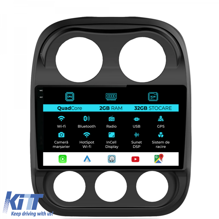 Old Description Operating System: Android 13 Processor: Quadcore RAM: 2GB Internal Storage (ROM): 32GB Display Size: 10 Inch Screen Resolution: 1280x800p Bluetooth: Bluetooth for calls phone book download and music playback WiFi: Yes (Integrated) 4G SIM Slot: No Network Connectivity: Phone hotspot external router 3G or 4G dongle CarPlay Android Auto Microphone: Built-in microphone with the option to connect an external microphone Power Supply: 12V Audio Power: 4x45W DSP Equalizer: Digital Sound Processor (DSP EQ) USB SD Compatibility: Suitable for USB up to 128GB SD support via USB adapter Android Apps Compatibility: Suitable for most Android apps from Google Play CarPlay and Android Auto Compatibility: Yes suitable for iOS (CarPlay) and Android (Android Auto) Language Support: Romanian English Hungarian Spanish Italian German etc. Screen Type: Capacitive TouchScreen multi-touch IPS Brightness Settings: Yes RDS Radio: Yes RCA Subwoofer Output: Yes RCA Video Output: Yes with the help of a USB adapter RCA Audio Output: Yes GPS: Yes (Google Maps Waze HereWeGo) Parking Sensors: Yes (Parking sensor integration with display where applicable) Steering Wheel Control: Yes (Steering wheel command integration with canbus or analog where applicable) DVR Camera Compatibility: Yes Reversing Camera Compatibility: Yes User Manual: Yes Package Contents: Android Navigation Adapter Frame Power Wiring GPS Antenna RCA Connectors Wiring for reversing camera 2 USB cables Canbus (only if applicable) Warranty Certificate Invoice Navigation is suitable for the following car brands: Jeep: Compass (2010 – 2016)