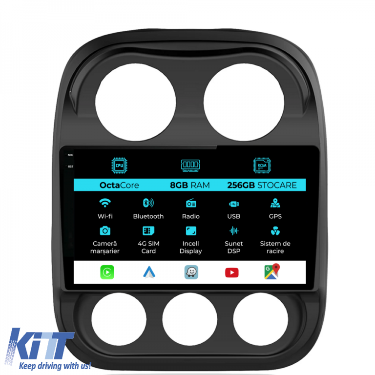 Old DescriptionOperating System: Android 13 Processor: Octa-core 1.8Ghz RAM: 8GB Internal storage (ROM): 256GB Display size: 10 Inch Screen resolution: 1280x800p Bluetooth: Bluetooth for calls phonebook download and music playback WiFi: Yes (Integrated) 4G SIM slot: Yes Network connectivity: 4G phone hotspot external router 3G or 4G dongle CarPlay Android Auto Microphone: Built-in microphone with option to connect external microphone Power supply: 12V Audio power: 4x45W DSP Equalizer: Digital sound processor (DSP EQ) USB SD compatibility: Suitable for USB up to 128GB SD support via USB adapter Android app compatibility: Suitable for most Android apps from Google Play CarPlay and Android Auto compatibility: Yes suitable for iOS (CarPlay) and Android (Android Auto) Language support: Romanian English Hungarian Spanish Italian German etc. Screen type: Capacitive TouchScreen multi-touch IPS Brightness settings: Yes RDS Radio: Yes RCA subwoofer output: Yes RCA video output: Yes with the help of a USB adapter RCA audio output: Yes GPS: Yes (Google Maps Waze HereWeGo) Parking sensors: Yes (Parking sensor integration with display where applicable) Steering wheel control: Yes (Steering wheel command integration with canbus or analog where applicable) DVR camera compatibility: Yes Reversing camera compatibility: Yes User manual: Yes Package contents: Android navigation Adapter frame Power wiring GPS antenna 4G antenna RCA connectors Wiring for reversing camera 2 USB cables Canbus (only if applicable) Warranty certificate Fiscal invoice Navigation is suitable for the following car brands: Jeep: Compass (2010 – 2016)