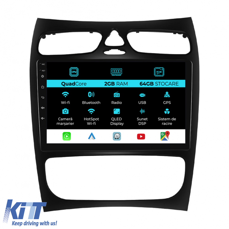 Old DescriptionOperating system: Android 13 Processor: Quadcore RAM Memory: 2GB Internal storage (ROM): 64GB Display size: 9 Inch Screen resolution: 1280x720p Bluetooth: Bluetooth for calls phonebook download and music playback WiFi: Yes (Integrated) 4G SIM Slot: No Network connectivity: Phone hotspot external router 3G or 4G dongle CarPlay Android Auto Microphone: Built-in microphone with the possibility of connecting an external microphone Power supply: 12V Audio power: 4x45W DSP equalizer: Digital sound processor (DSP EQ) USB SD compatibility: Suitable for USB up to 128GB SD support via USB adapter Android app compatibility: Suitable for most Android apps from Google Play CarPlay and Android Auto compatibility: Yes suitable for iOS (CarPlay) and Android (Android Auto) Language support: Romanian English Hungarian Spanish Italian German etc. Screen type: Capacitive TouchScreen multi-touch IPS Brightness settings: Yes RDS Radio: Yes RCA subwoofer output: Yes RCA video output: Yes using a USB adapter RCA audio output: Yes GPS: Yes (Google Maps Waze HereWeGo) Parking sensors: Yes (Parking sensor acquisition with display where applicable) Steering wheel control: Yes (Steering wheel control acquisition with canbus or analog where applicable) DVR camera compatibility: Yes Reversing camera compatibility: Yes User manual: Yes Package content: Android navigation Adapter frame Power wiring GPS antenna RCA connectors Wiring for reversing camera 2 USB cables Canbus (only if applicable) Warranty certificate Fiscal invoice Navigation is suitable for the following car brands: Mercedes Benz: C-Class W203 (2000 – 2005) CLK W209 (1998 – 2005)