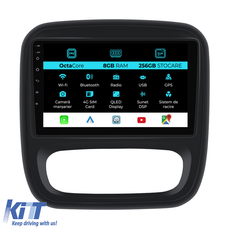 Old DescriptionOperating System: Android 13 Processor: Octa-core 2.0GHz RAM: 8GB Internal Storage (ROM): 256GB Display Size: 9 Inch Screen Resolution: 1280x720p Bluetooth: Bluetooth for calls phonebook download and music playback WiFi: Yes (Built-in) 4G SIM Slot: Yes Network Connectivity: 4G Phone hotspot external router 3G or 4G dongle CarPlay Android Auto Microphone: Built-in microphone with external microphone connection option Power Supply: 12V Audio Power: 4x45W DSP Equalizer: Digital Sound Processor (DSP EQ) USB SD Compatibility: Suitable for USB up to 128GB SD support via USB adapter Android App Compatibility: Suitable for most Android apps from Google Play CarPlay and Android Auto Compatibility: Yes suitable for iOS (CarPlay) and Android (Android Auto) Language Support: Romanian English Hungarian Spanish Italian German etc. Screen Type: Capacitive TouchScreen multi-touch IPS Brightness Settings: Yes RDS Radio: Yes RCA Subwoofer Output: Yes RCA Video Output: Yes with the help of a USB adapter RCA Audio Output: Yes GPS: Yes (Google Maps Waze HereWeGo) Parking Sensors: Yes (Parking sensor display where applicable) Steering Wheel Control: Yes (Steering wheel commands pickup with canbus or analog where applicable) DVR Camera Compatibility: Yes Reverse Camera Compatibility: Yes User Manual: Yes Package Contents: Android Navigation Adapter Frame Power Wiring GPS Antenna 4G Antenna RCA Connectors Wiring for reverse camera 2 USB cables Canbus (only if applicable) Warranty Certificate Fiscal Invoice Navigation is suitable for the following car brands: Opel: Vivaro (2014 – 2018) Renault: Trafic (2015 – 2019) Fiat: Talento (2016 – 2023)