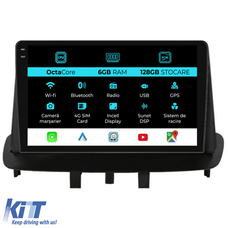 Old DescriptionOperating System: Android 13 Processor: Octa-core 1.6Ghz RAM Memory: 6GB Internal Storage (ROM): 128GB Display Size: 9 Inch Screen Resolution: 1360x800p Bluetooth: Bluetooth for calls phonebook download and music playback WiFi: Yes (Integrated) 4G Sim Slot: Yes Network Connectivity: 4G phone hotspot external router 3G or 4G dongle CarPlay Android Auto Microphone: Built-in microphone with the possibility of connecting an external microphone Power Supply: 12V Audio Power: 4x45W DSP Equalizer: Digital Sound Processor (DSP EQ) USB SD Compatibility: Suitable for USB up to 128GB SD support via USB adapter Android Apps Compatibility: Suitable for most Android apps from Google Play CarPlay and Android Auto Compatibility: Yes suitable for iOS (CarPlay) and Android (Android Auto) Language Support Romanian English Hungarian Spanish Italian German etc. Screen Type: Capacitive TouchScreen multi-touch IPS Brightness Settings: Yes RDS Radio: Yes RCA Subwoofer Output: Yes RCA Video Output: Yes with the help of a USB adapter RCA Audio Output: Yes GPS: Yes (Google Maps Waze HereWeGo) Parking Sensors: Yes (Retrieves parking sensors with display where applicable) Steering Wheel Control: Yes (Retrieves steering wheel controls with canbus or analog where applicable) DVR Camera Compatibility: Yes Rearview Camera Compatibility: Yes User Manual: Yes Package Contents: Android Navigation Adapter Frame Power Wiring GPS Antenna 4G Antenna RCA Connectors Wiring for rearview camera 2 USB cables Canbus (only if applicable) Warranty Certificate Fiscal Invoice The navigation is suitable for the following car brands: Renault: Megane 3 (2008 – 2015) Fluence (2008 – 2015)
