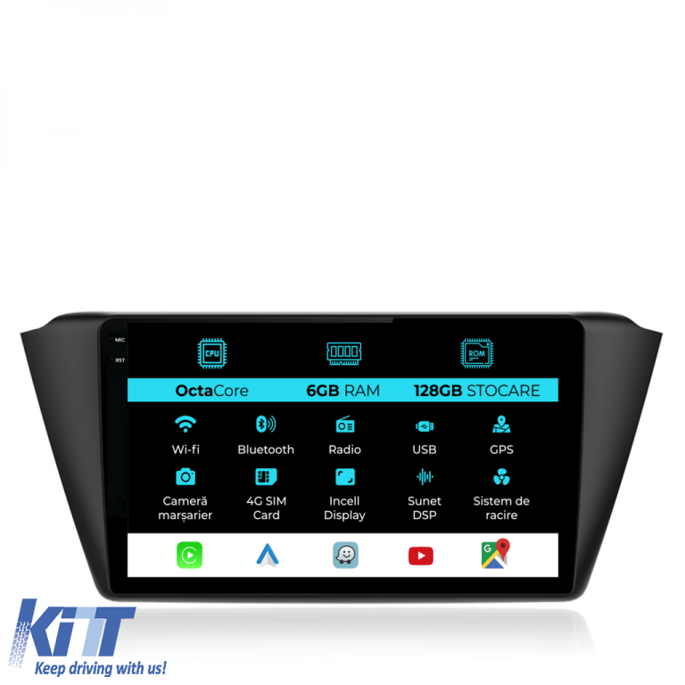 Old DescriptionOperating System: Android 13 Processor: Octa-core 1.6Ghz RAM Memory: 6GB Internal Storage (ROM): 128GB Display Size: 9 Inch Screen Resolution: 1360x800p Bluetooth: Bluetooth for calls phonebook download and music playback WiFi: Yes (Integrated) 4G SIM Slot: Yes Network Connectivity: 4G phone hotspot external router 3G or 4G dongle CarPlay Android Auto Microphone: Built-in microphone with the possibility of connecting an external microphone Power Supply: 12V Audio Power: 4x45W DSP Equalizer: Digital Sound Processor (DSP EQ) USB SD Compatibility: Suitable for USB up to 128GB SD support via USB adapter Android App Compatibility: Suitable for most Android apps from Google Play CarPlay and Android Auto Compatibility: Yes suitable for iOS (CarPlay) and Android (Android Auto) Language Support: Romanian English Hungarian Spanish Italian German etc. Screen Type: Capacitive TouchScreen multi-touch IPS Brightness Settings: Yes RDS Radio: Yes RCA Subwoofer Output: Yes RCA Video Output: Yes with the help of a USB adapter RCA Audio Output: Yes GPS: Yes (Google Maps Waze HereWeGo) Parking Sensors: Yes (Acquisition of parking sensors with display where applicable) Steering Wheel Control: Yes (Acquire steering wheel commands with canbus or analog where applicable) DVR Camera Compatibility: Yes Rear View Camera Compatibility: Yes User Manual: Yes Package Contents: Android Navigation Adapter Frame Power Supply Wiring GPS Antenna 4G Antenna RCA Connectors Wiring for rearview camera 2 USB cables Canbus (only if applicable) Warranty Certificate Fiscal Invoice Navigation is suitable for the following car brands: Skoda: Fabia 3 (2014 – 2019)