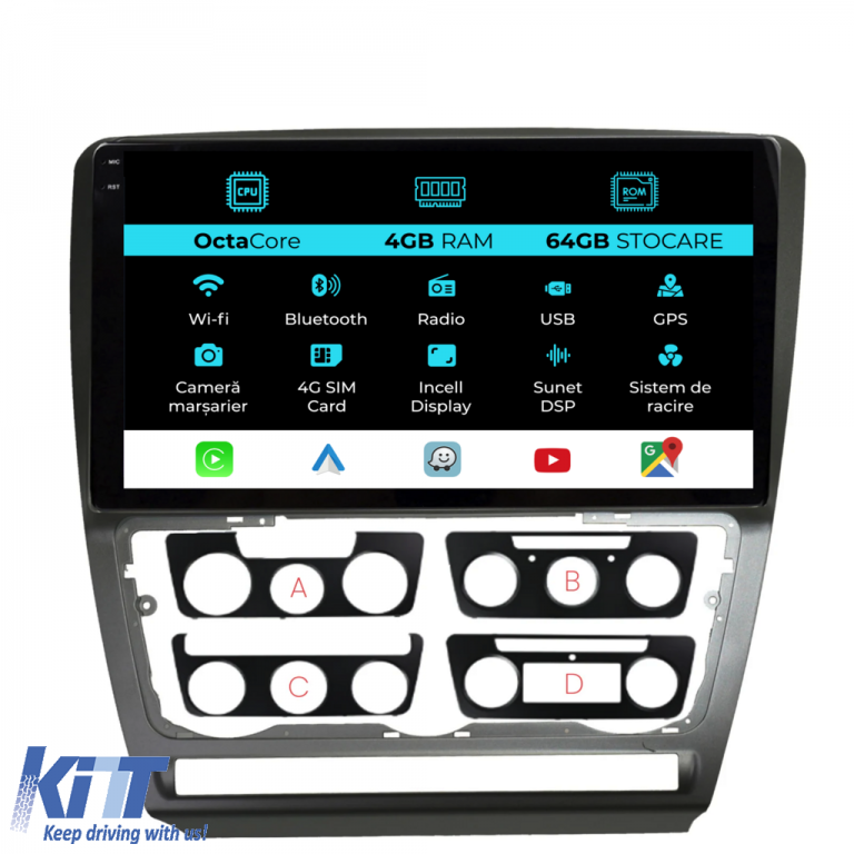 Old DescriptionOperating system: Android 13 Processor: Octa-core RAM: 4GB Internal storage (ROM): 64GB Display size: 10 Inch Screen resolution: 1280x800p Bluetooth: Bluetooth for calls phonebook download and music playback WiFi: Yes (Integrated) 4G Sim Slot: Yes Network connectivity: 4G phone hotspot external router 3G or 4G dongle CarPlay Android Auto Microphone: Built-in microphone with option for external microphone connection Power supply: 12V Audio power: 4x45W DSP equalizer: Digital sound processor (DSP EQ) USB SD compatibility: Suitable for USB up to 128GB SD support via USB adapter Android app compatibility: Suitable for most Android applications from Google Play CarPlay and Android Auto compatibility: Yes suitable for iOS (CarPlay) and Android (Android Auto) Language support: Romanian English Hungarian Spanish Italian German etc. Screen type: Capacitive touchscreen multi-touch IPS Brightness settings: Yes RDS radio: Yes Subwoofer RCA output: Yes Video RCA output: Yes with the help of a USB adapter Audio RCA output: Yes GPS: Yes (Google Maps Waze HereWeGo) Parking sensors: Yes (Integration of parking sensors with display where applicable) Steering wheel control: Yes (Integration of steering wheel controls with canbus or analog where applicable) DVR camera compatibility: Yes Rearview camera compatibility: Yes User manual: Yes Package contents: Android navigation Adapter frame Power wiring GPS antenna 4G antenna RCA connectors Wiring for rearview camera 2 USB cables Canbus (only if applicable) Warranty certificate Invoice The navigation is suitable for the following car brands: Skoda: Octavia (2004-2013)