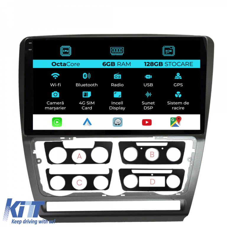 Old DescriptionOperating system: Android 13 Processor: Octa-core 1.6Ghz RAM: 6GB Internal storage (ROM): 128GB Display size: 10 Inch Screen resolution: 1280x800p Bluetooth: Bluetooth for calls downloading phonebook and music playback WiFi: Yes (Integrated) 4G Sim Slot: Yes Network connectivity: 4G phone hotspot external router 3G or 4G dongle CarPlay Android Auto Microphone: Built-in microphone with the possibility of connecting an external microphone Power supply: 12V Audio power: 4x45W DSP equalizer: Digital sound processor (DSP EQ) USB SD compatibility: Suitable for USB up to 128GB SD support via USB adapter Android app compatibility: Suitable for most Android apps from Google Play CarPlay and Android Auto compatibility: Yes suitable for iOS (CarPlay) and Android (Android Auto) Language support: Romanian English Hungarian Spanish Italian German etc. Screen type: Capacitive TouchScreen multi-touch IPS Brightness settings: Yes RDS radio: Yes RCA subwoofer output: Yes RCA video output: Yes with the help of a USB adapter RCA audio output: Yes GPS: Yes (Google Maps Waze HereWeGo) Parking sensors: Yes (Pickup parking sensors with display where applicable) Steering control: Yes (Pickup steering commands with canbus or analog where applicable) DVR camera compatibility: Yes Reverse camera compatibility: Yes User manual: Yes Package contents: Android navigation Adapter frame Power wiring GPS antenna 4G antenna RCA connectors Wiring for reverse camera 2 USB cables Canbus (only if applicable) Warranty certificate Fiscal invoice Navigation is suitable for the following car brands: Skoda: Octavia (2004-2013)