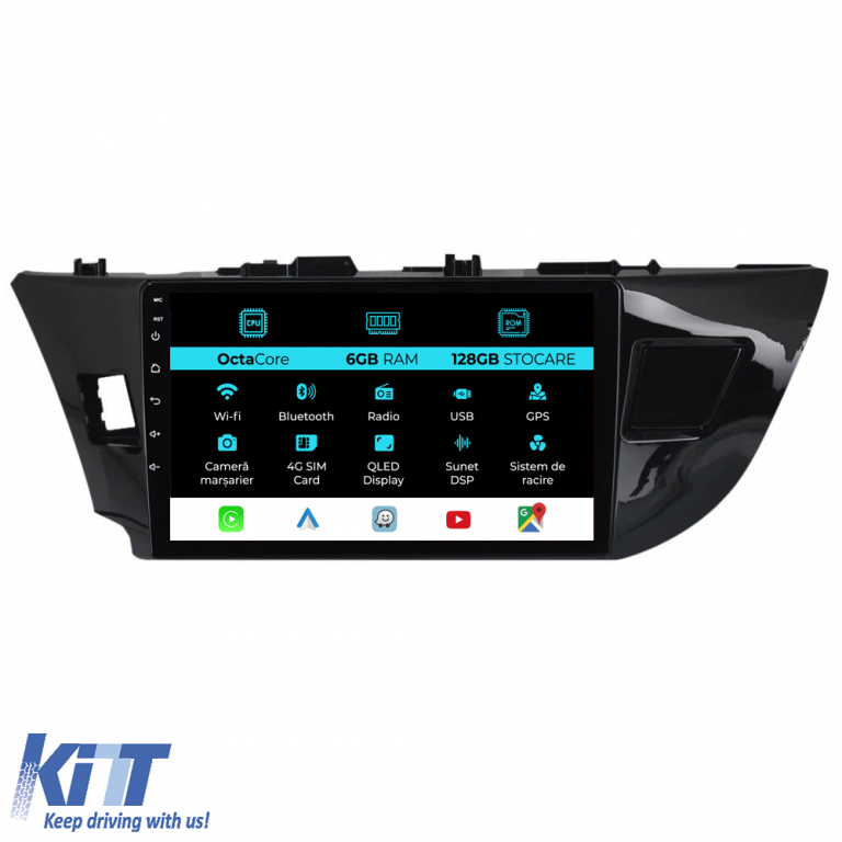 Old DescriptionOperating system: Android 13 Processor: Octa-core 1.8Ghz RAM Memory: 6GB Internal Storage (ROM): 128GB Display Size: 10 Inch Screen Resolution: 1280x720p Bluetooth: Bluetooth for calls phone book download and music playback WiFi: Yes (Built-in) 4G Sim Slot: Yes Network Connectivity: 4G phone hotspot external router 3G or 4G dongle CarPlay Android Auto Microphone: Built-in microphone with the possibility of connecting an external microphone Power Supply: 12V Audio Power: 4x45W DSP Equalizer: Digital sound processor (DSP EQ) USB SD compatibility: Suitable for USB up to 128GB SD support via USB adapter Android app compatibility: Suitable for most Android apps from Google Play CarPlay and Android Auto compatibility: Yes suitable for iOS (CarPlay) and Android (Android Auto) Language support: Romanian English Hungarian Spanish Italian German etc. Screen Type: Capacitive TouchScreen multi-touch IPS Brightness Settings: Yes RDS Radio: Yes RCA Subwoofer Output: Yes RCA Video Output: Yes with the help of a USB adapter RCA Audio Output: Yes GPS: Yes (Google Maps Waze HereWeGo) Parking Sensors: Yes (Pickup for parking sensors with display where applicable) Steering Wheel Control: Yes (Pickup for steering wheel controls with canbus or analog where applicable) DVR Camera Compatibility: Yes Reverse Camera Compatibility: Yes User Manual: Yes Package Contents: Android Navigation Adapter Frame Power Wiring GPS Antenna 4G Antenna RCA Connectors Wiring for reverse camera 2 USB cables Canbus (only if applicable) Warranty Certificate Invoice The navigation is suitable for the following car brands: Toyota: Corolla (2013 – 2019)