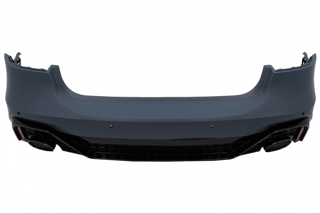 Rear bumper with piano black diffuser with twin single outlet exhaust mufflers tow hook cover and red side reflectors.