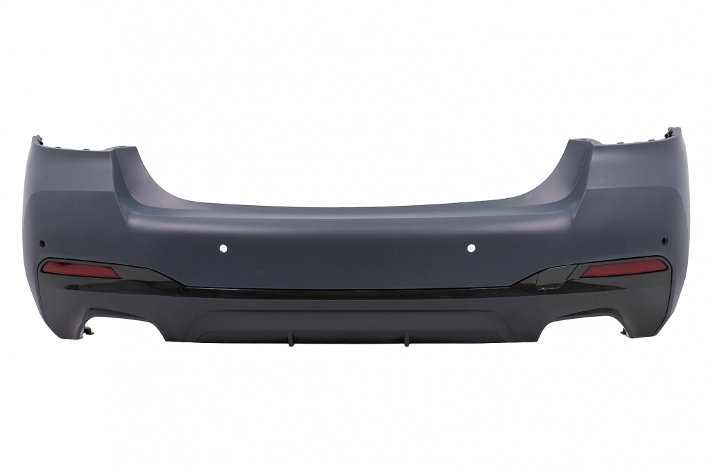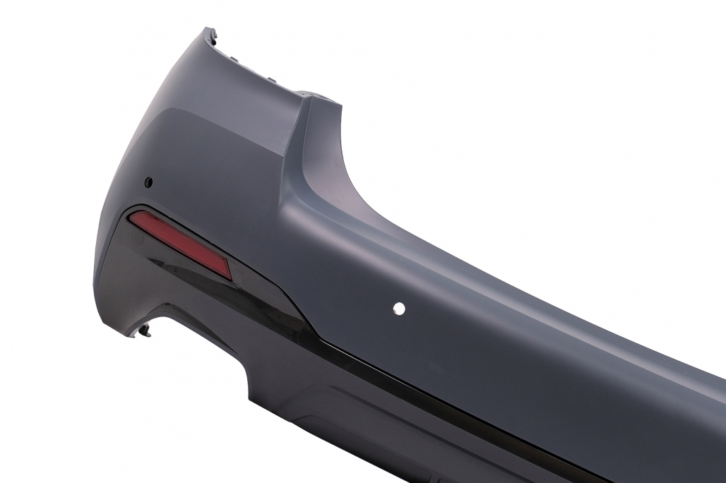 The rear bumper is equipped with PDC holes tow hook cover diffusor with twin outlet for twin muffler tips and red reflector.
