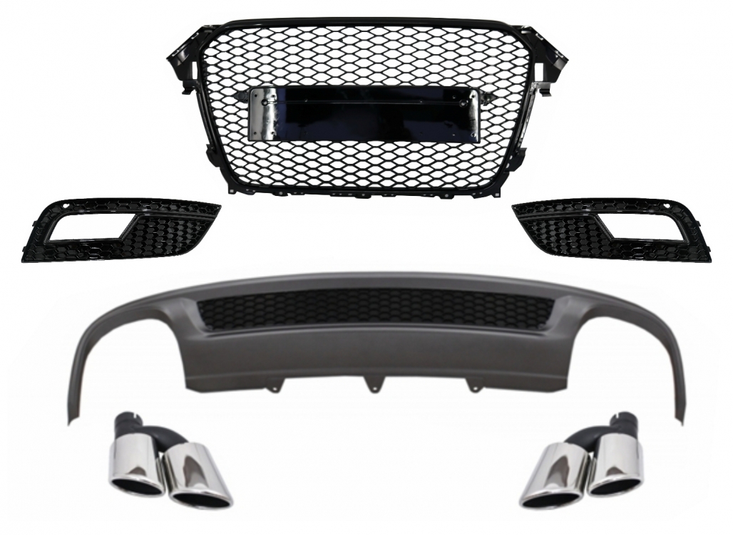 Rear Bumper Valance Air Diffuser and Exhaust Muffler Tips suitable for AUDI A4 B8 Facelift Limousine/Avant (2012-2015) with Badgeless Front Grille and Fog Lamp Covers S-Line Look only Standard Bumper