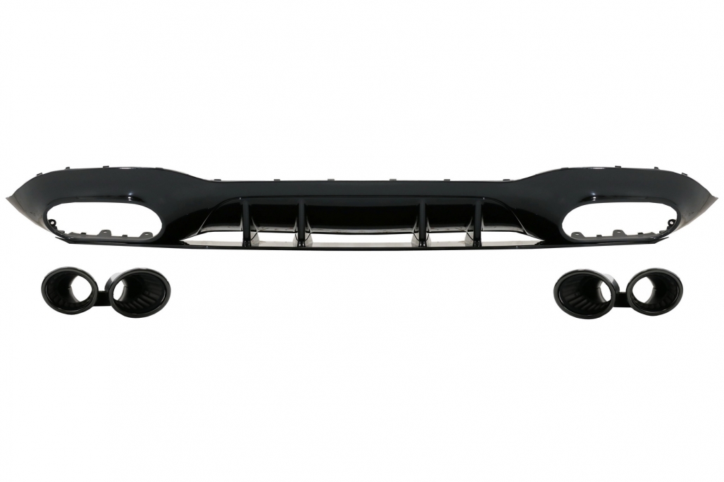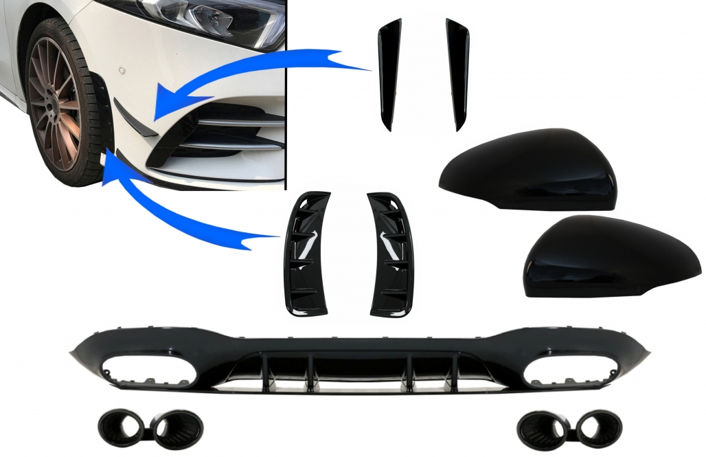 Rear Diffuser with Front Side Vents and Flaps Side Fins & Mirror Cover suitable for Mercedes A-Class V177 Sedan (2018-2022) Black Exhaust
